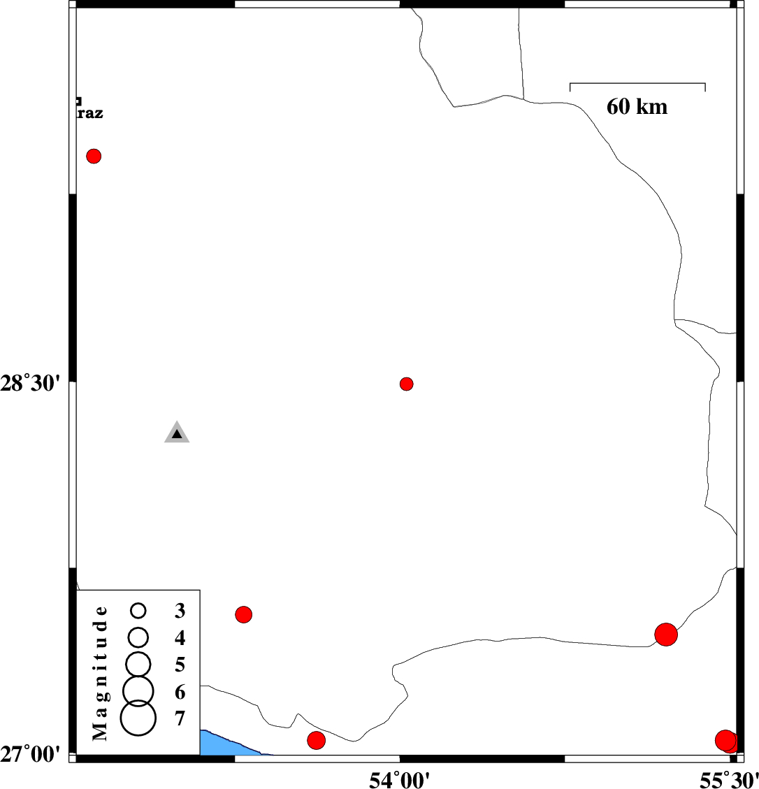 2010/01/14 | 14:55:10.3 | 18:25:10.3 | 28.49 | 54.03 | 14 | ML:2.7 | 45 km East of Jahrom, Fars Province | ||
