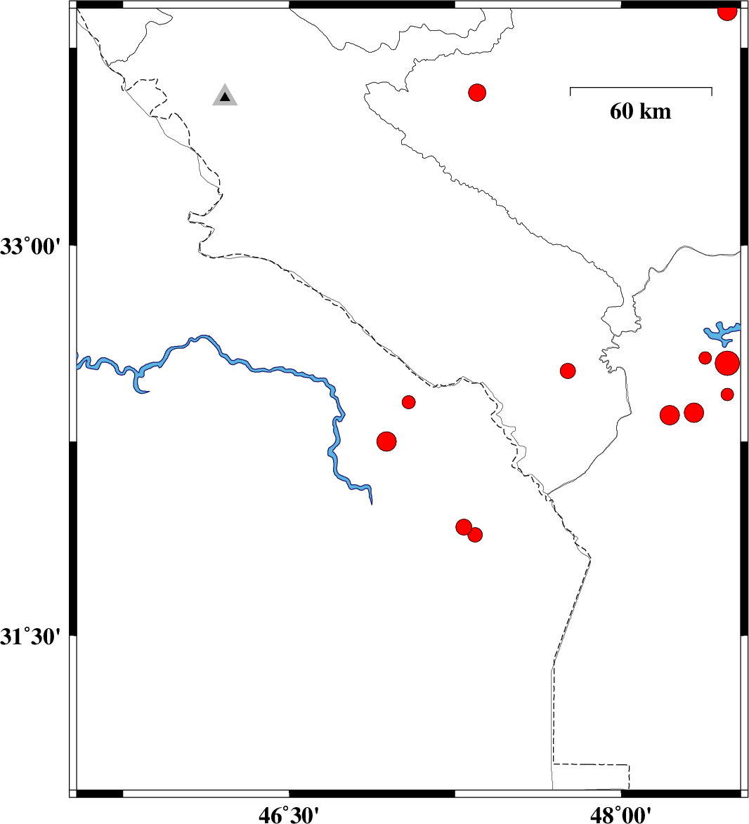 2009/12/31 | 04:30:16.9 | 08:00:16.9 | 31.92 | 47.29 | 35 | ML3.2 | Iraq, 86 km South of Dehloran | ||