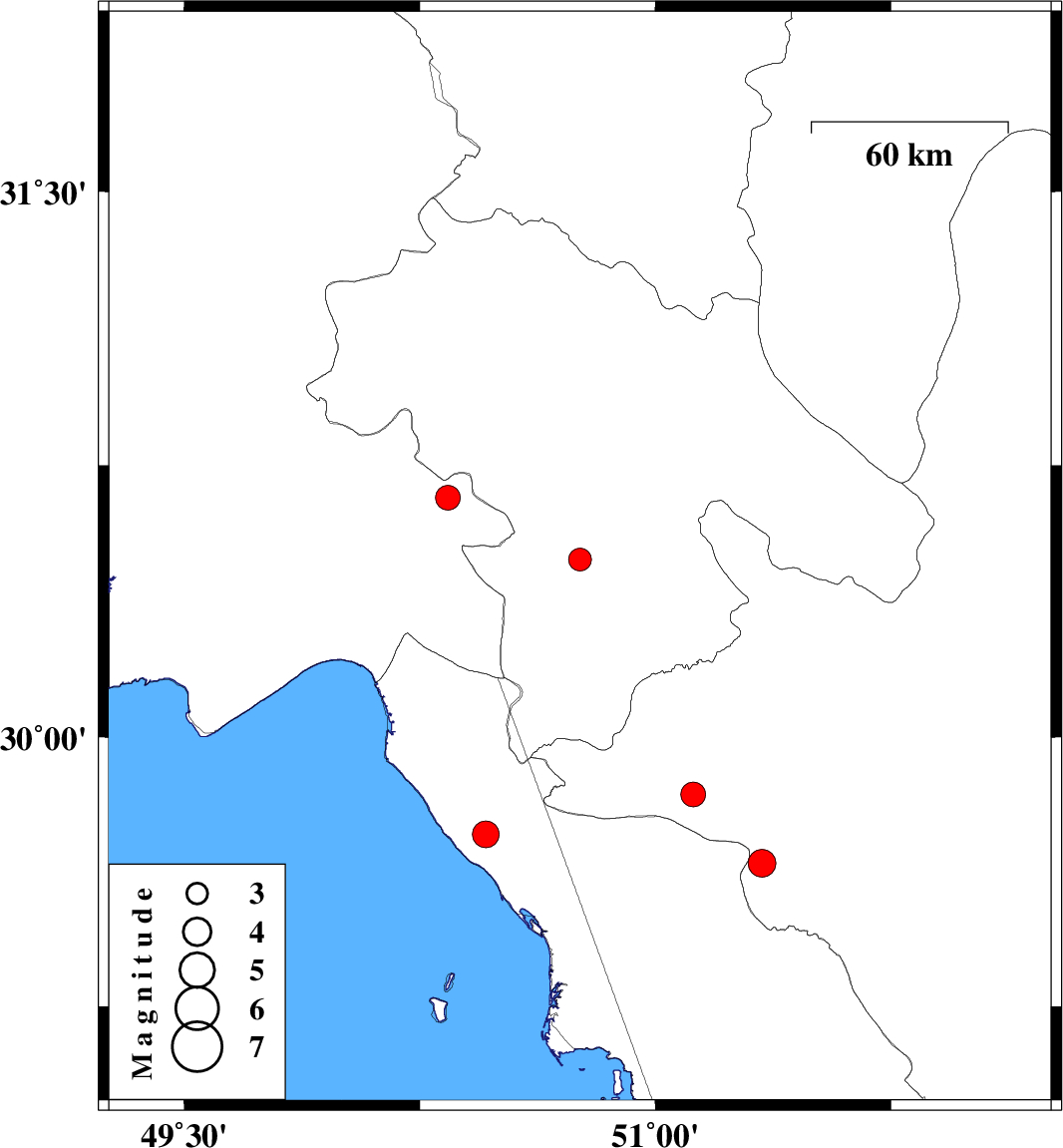 2010/01/14 | 00:52:00.5 | 04:22:00.5 | 29.73 | 50.46 | 28 | ML:3.8 | 18 km North of Bandar-e genaveh, Bushehr Province | ||