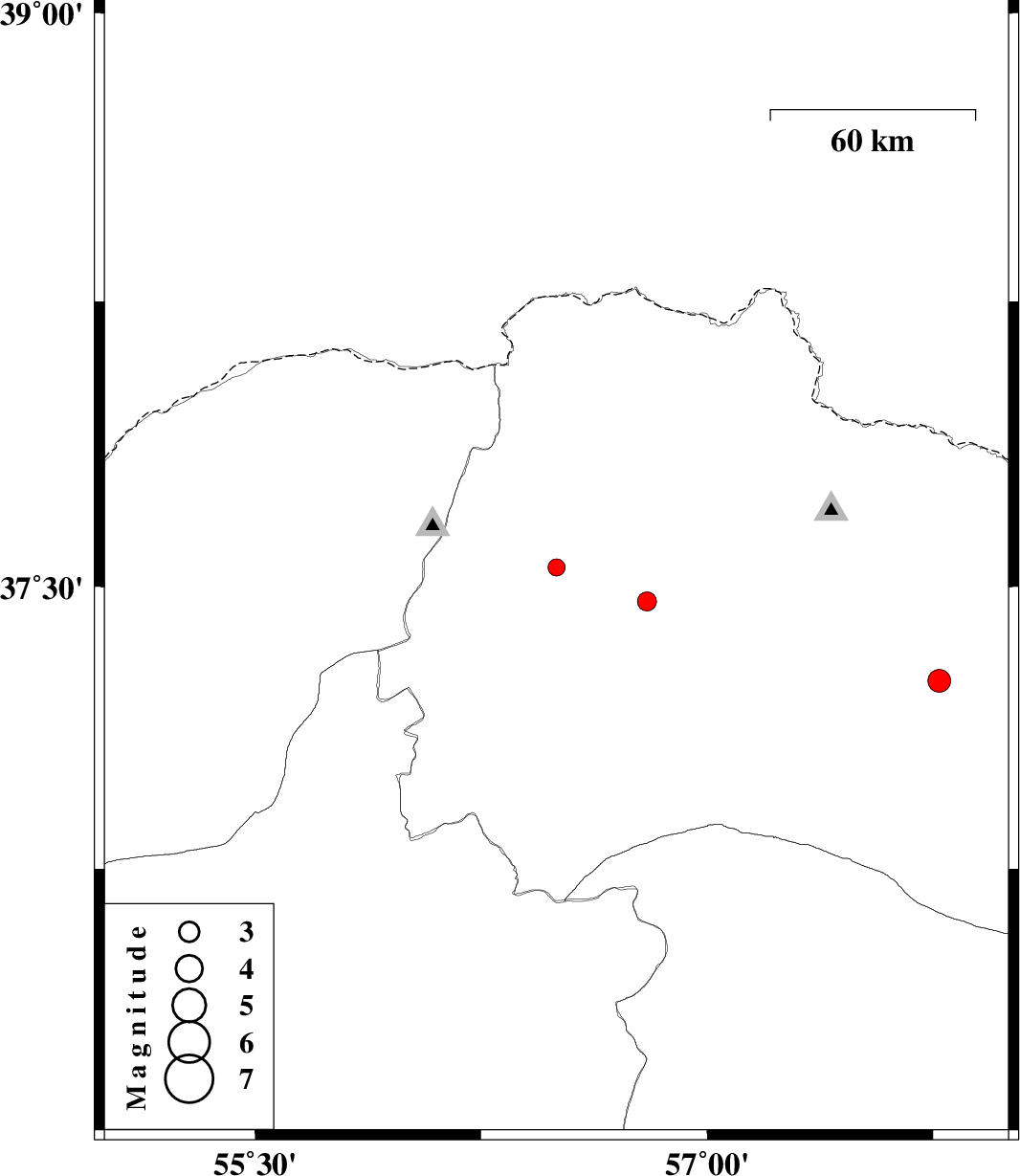 2010/01/30 | 13:50:04.2 | 17:20:04.2 | 37.25 | 57.77 | 14 | ML:3.4 | 20 km South-West of Shirvan, Khorasan(north) Province | ||