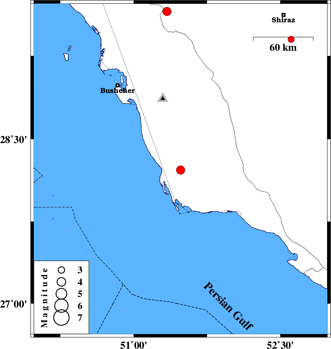 2010/01/08 | 02:28:18.5 | 05:58:18.5 | 29.4 | 52.61 | 46 | ML:3 | 25 km South of Shiraz, Fars Province |