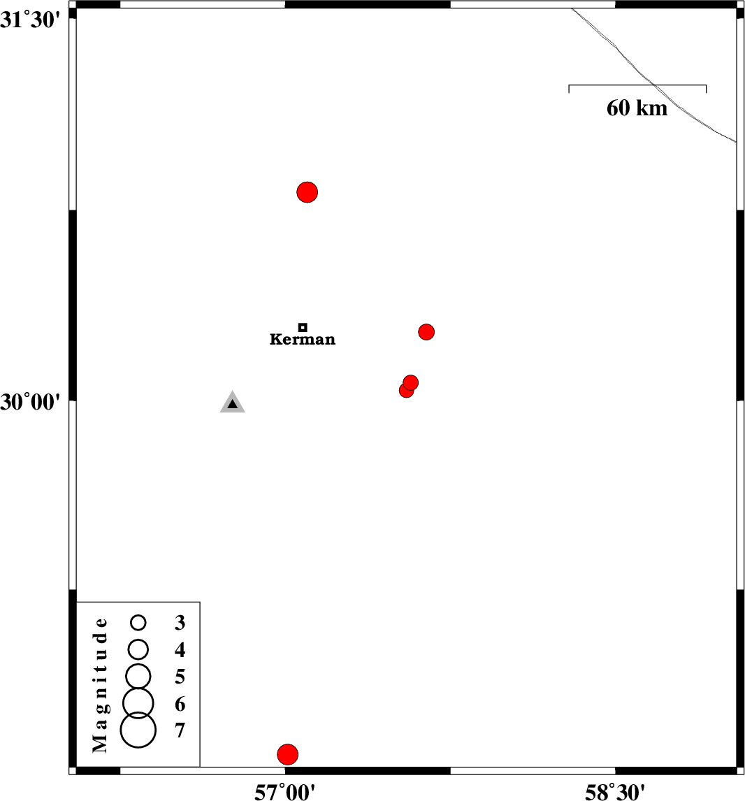 2010/02/07 | 07:55:01.0 | 11:25:01.0 | 30.04 | 57.55 | 6 | ML:3 | 52 km South-East of Kerman, Kerman Province | ||
