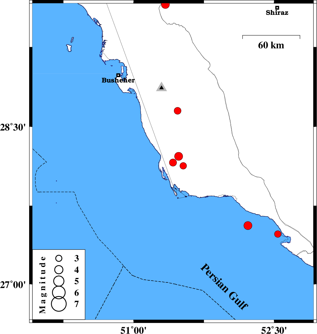 2010/02/04 | 23:40:08.6 | 03:10:08.6 | 27.48 | 52.54 | 20 | ML:3.3 | Persian Gulf, 35 km West of Mehr | ||