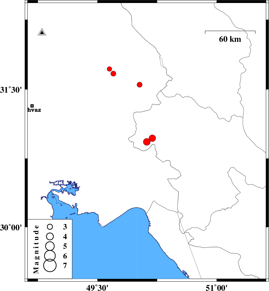 2010/02/08 | 21:55:27.3 | 01:25:27.3 | 31.55 | 50.03 | 14 | ML:2.9 | 13 km East of Bagh Malek, Khoozestan Province | ||
