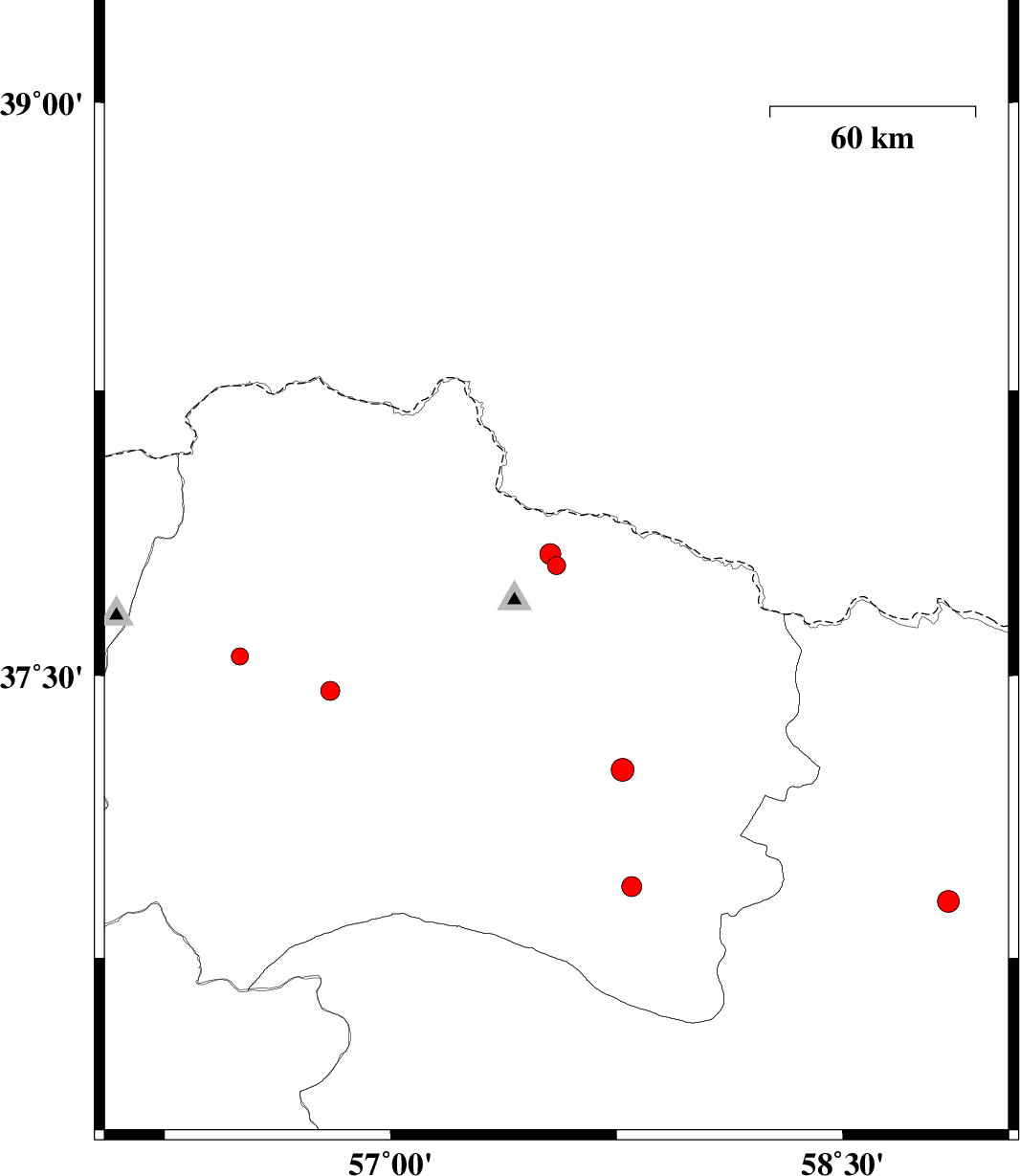2010/02/14 | 02:19:42.0 | 05:49:42.0 | 37.79 | 57.55 | 6 | ML:2.7 | 39 km North-East of Bojnurd, Khorasan(north) Province | ||