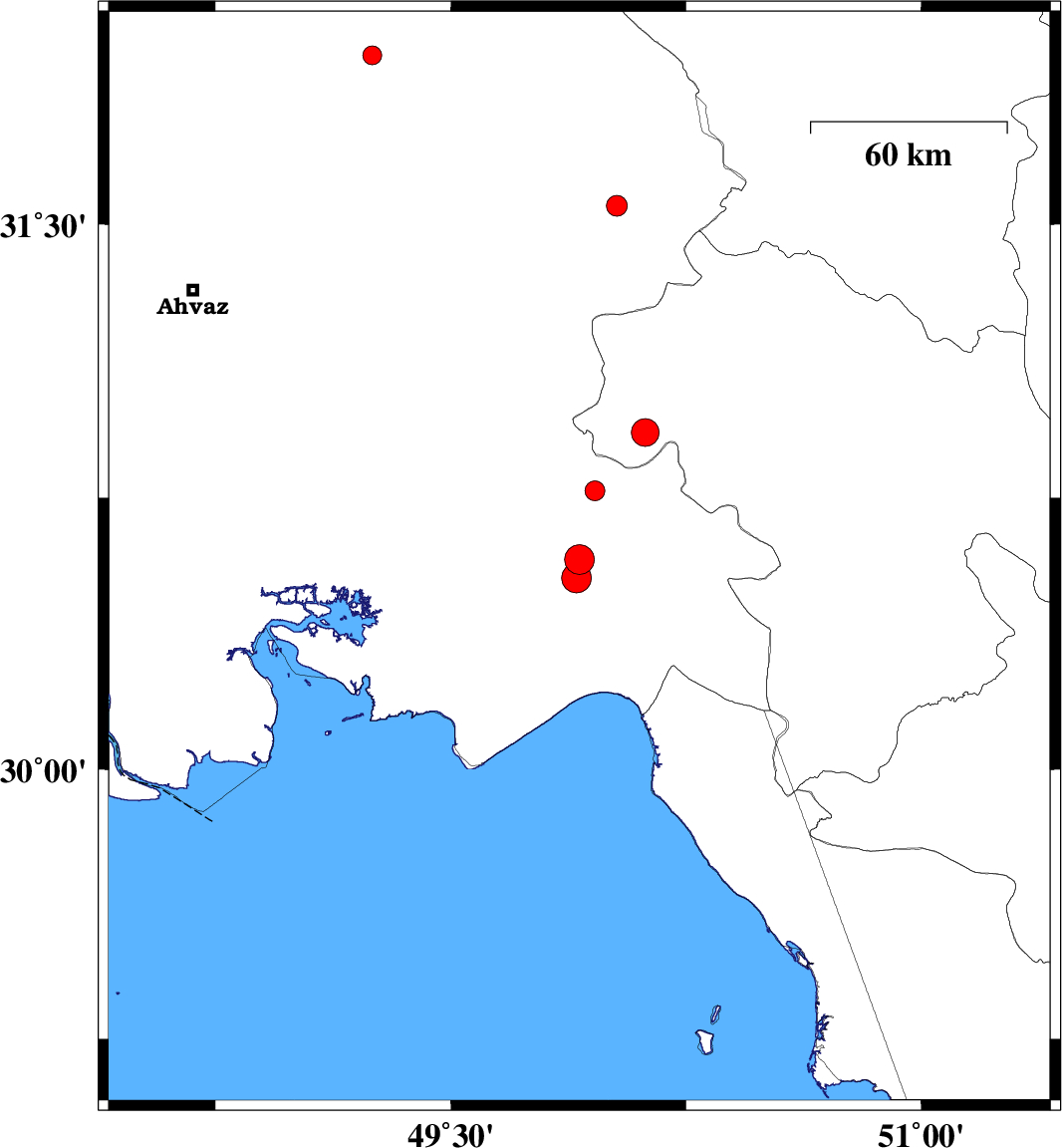 2010/02/14 | 03:26:47.2 | 06:56:47.2 | 30.58 | 49.91 | 43 | ML4.2 | 28 km South-East of Omidiyeh, Khoozestan Province | ||