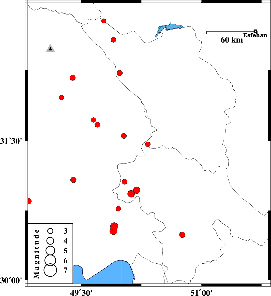 2010/01/28 | 13:35:42.1 | 17:05:42.1 | 32.22 | 49.98 | 44 | ML3.1 | 30 km South-West of Chelgard, Chaharmahal Bakhtiari Province | ||