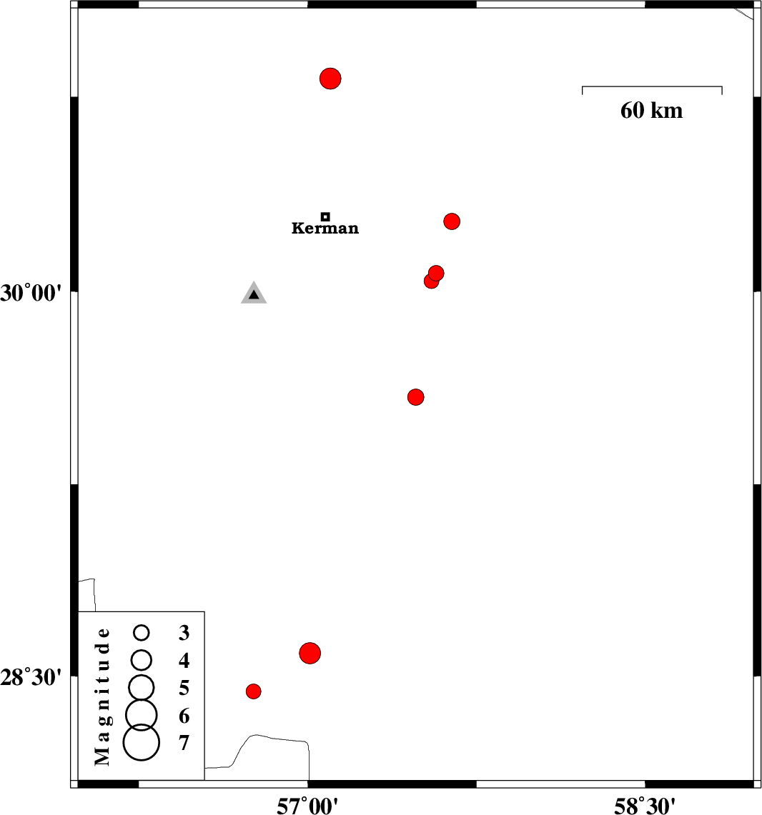 2010/02/07 | 07:55:01.0 | 11:25:01.0 | 30.04 | 57.55 | 6 | ML:3 | 52 km South-East of Kerman, Kerman Province | ||