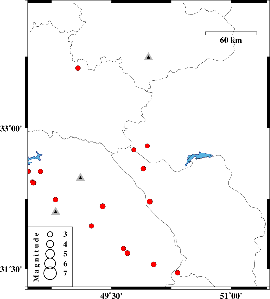 2010/02/17 | 07:14:55.2 | 10:44:55.2 | 32.81 | 49.95 | 15 | ML2.6 | 21 km South-West of Fereydunshahr, Esfahan Province | ||