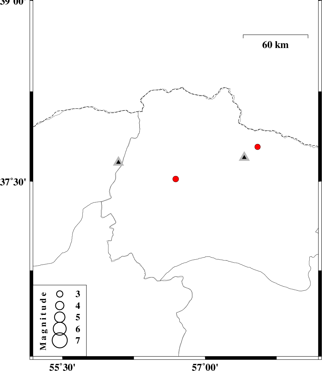 2010/02/14 | 02:19:42.0 | 05:49:42.0 | 37.79 | 57.55 | 6 | ML:2.7 | 39 km North-East of Bojnurd, Khorasan(north) Province |