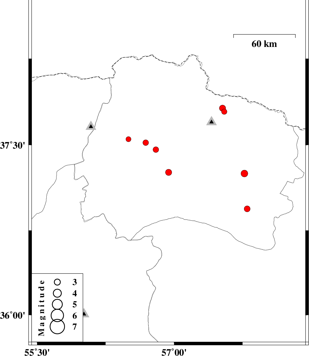 2010/02/14 | 02:19:42.0 | 05:49:42.0 | 37.79 | 57.55 | 6 | ML:2.7 | 39 km North-East of Bojnurd, Khorasan(north) Province | ||