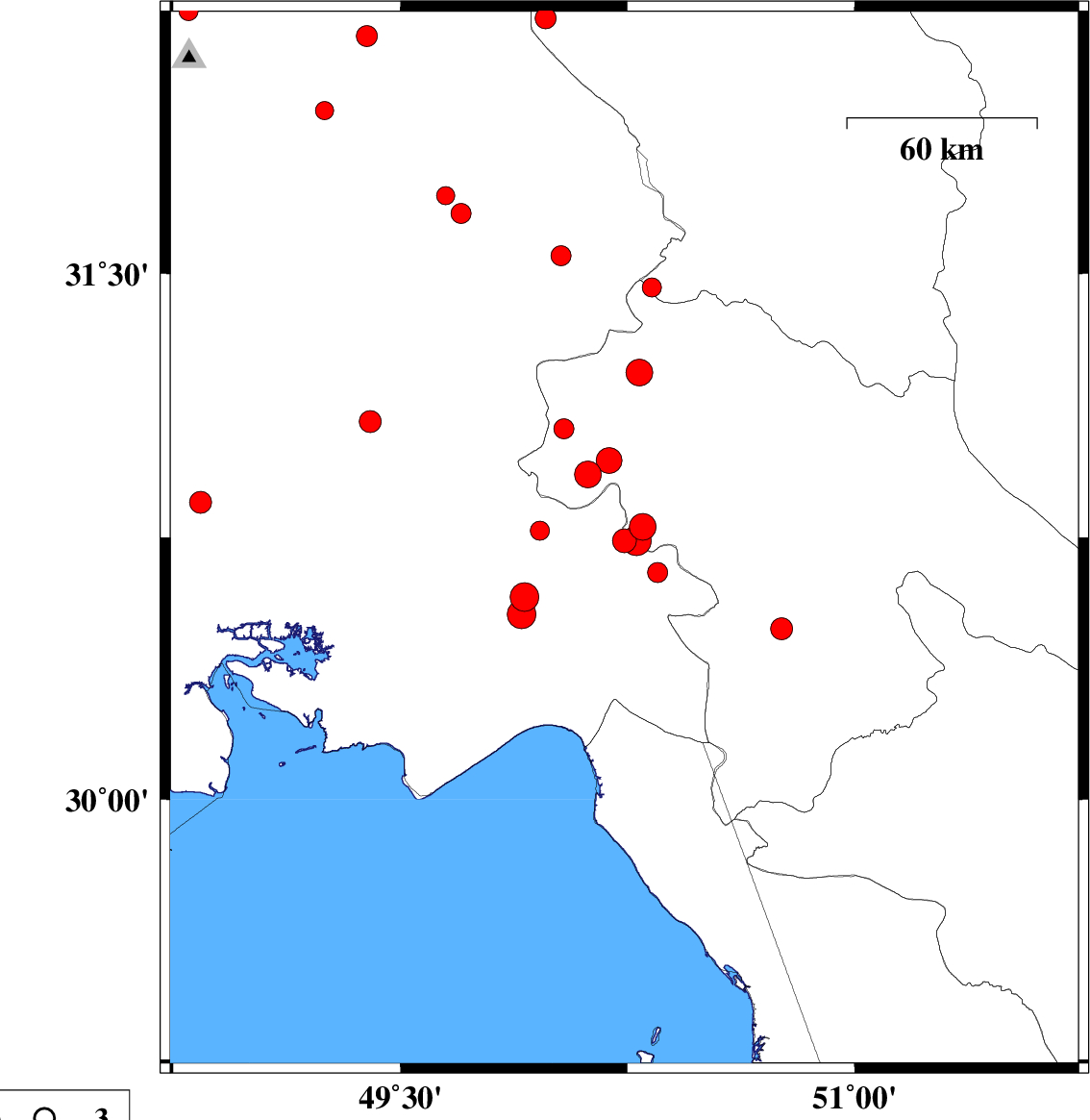 2010/01/30 | 11:56:46.3 | 15:26:46.3 | 31.08 | 49.4 | 37 | ML:3.3 | 29 km South-West of Ramhormoz, Khoozestan Province | ||