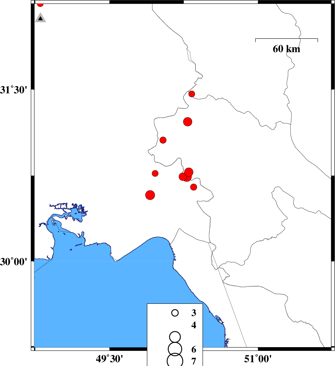 2010/02/20 | 09:33:53.4 | 13:03:53.4 | 30.78 | 50.3 | 17 | ML:3.9 | 21 km North of Behbahan, Khoozestan Province | ||