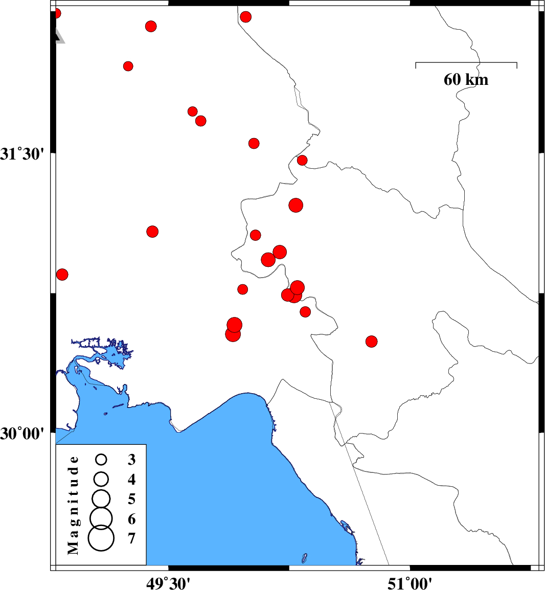 2010/02/11 | 21:07:52.6 | 00:37:52.6 | 30.93 | 50.12 | 15 | ML:3.9 | 39 km North-West of Behbahan, Khoozestan Province | ||