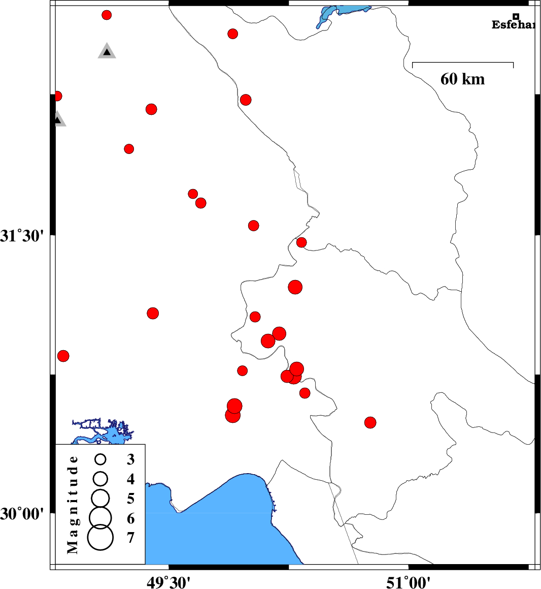 2010/02/20 | 09:36:44.3 | 13:06:44.3 | 31.22 | 50.29 | 33 | ML4 | 49 km South-East of Bagh Malek, Khoozestan Province | ||