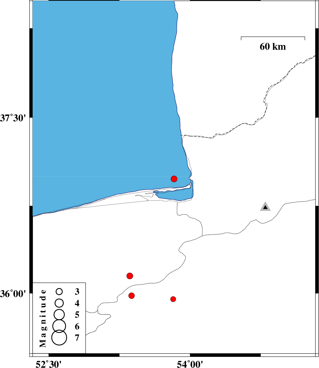 2010/02/22 | 19:54:28.1 | 23:24:28.1 | 36.98 | 53.83 | 15 | ML3 | Caspian Sea, 24 km West of Bandar-e torkaman | ||