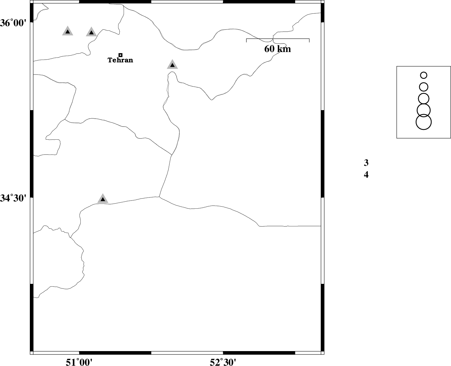 2010/02/24 | 04:54:51.8 | 08:24:51.8 | 34.66 | 52.02 | 43 | ML2.6 | Semnan Province, 69 km South-West of Garmsar | ||