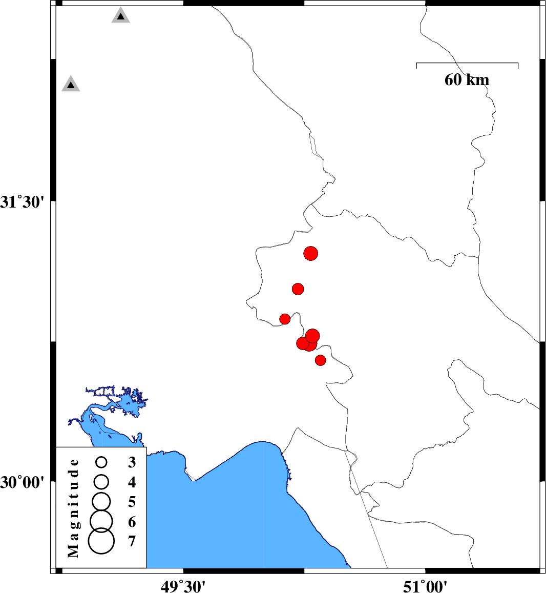 2010/02/20 | 09:36:44.3 | 13:06:44.3 | 31.22 | 50.29 | 33 | ML4 | 49 km South-East of Bagh Malek, Khoozestan Province | ||