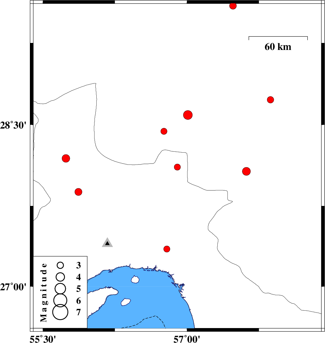 2010/02/09 | 01:12:50.7 | 04:42:50.7 | 27.21 | 55.68 | 14 | ML:2.5 | 59 km West of Bandar-e abbas, Hormozgan Province | ||