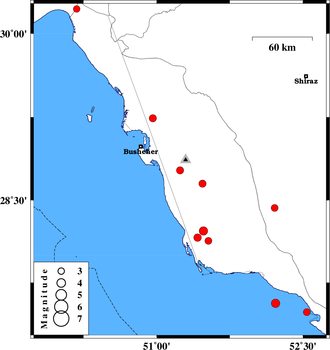 | 2010/03/03 | 06:56:32.5 | 10:26:32.5 | 28.77 | 51.24 | 15 | ML3.4 | Bushehr Province, 12 km South of Ahram | ||