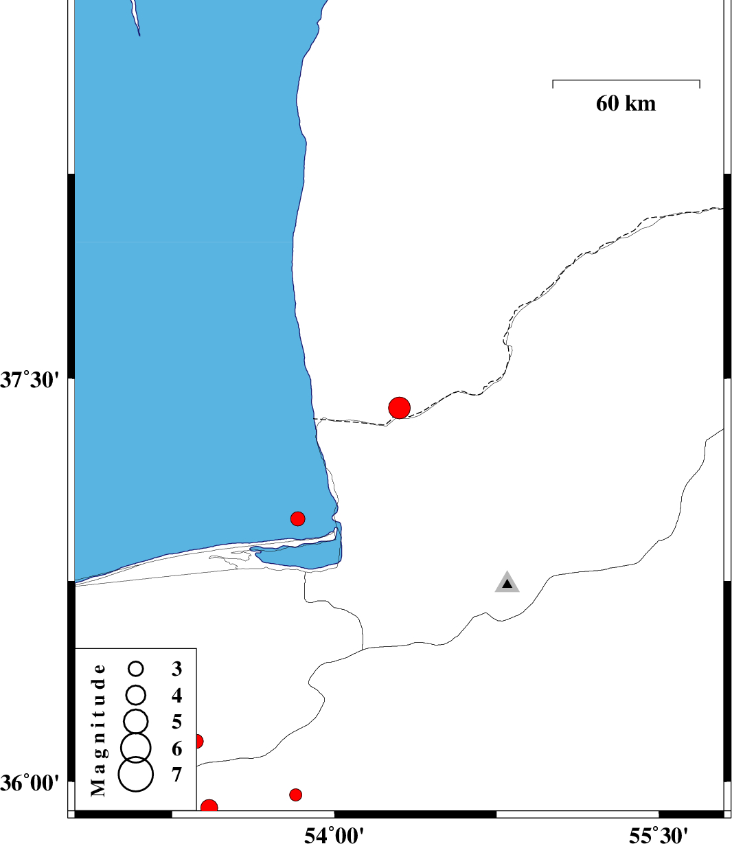 2010/02/22 | 19:54:28.1 | 23:24:28.1 | 36.98 | 53.83 | 15 | ML:3 | Caspian Sea, 24 km West of Bandar-e torkaman | ||