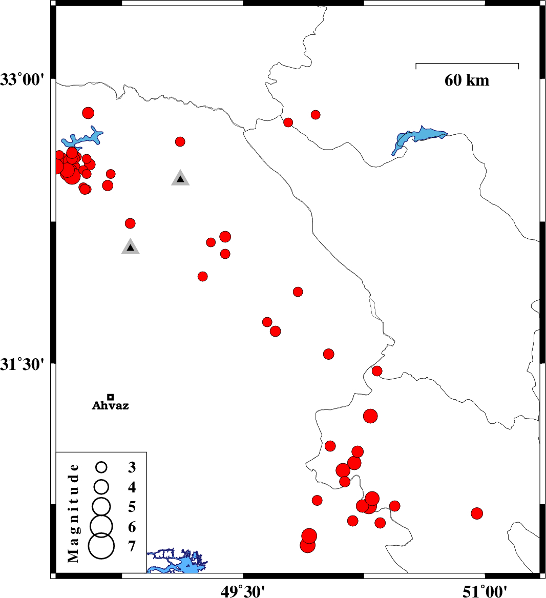2010/02/20 | 09:36:44.3 | 13:06:44.3 | 31.22 | 50.29 | 33 | ML4 | 49 km South-East of Bagh Malek, Khoozestan Province | ||