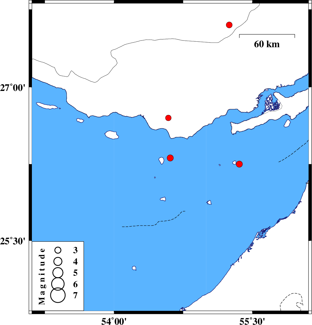 | 2010/03/14 | 15:50:59.8 | 19:20:59.8 | 26.25 | 55.36 | 18 | ML3.1 | Persian Gulf, 53 km North-East of Abu Musa | ||