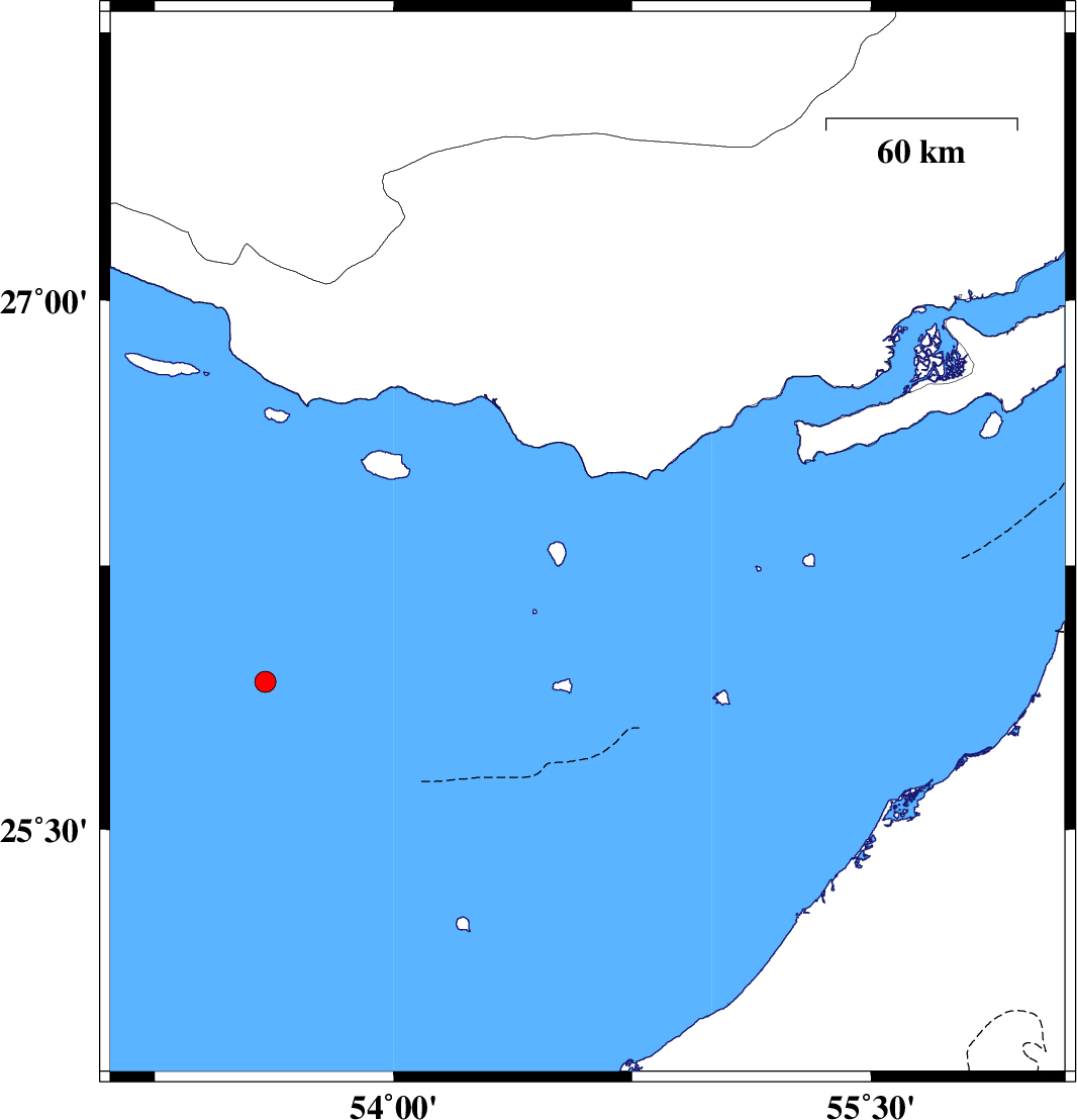 2010/03/14 | 15:50:59.8 | 19:20:59.8 | 26.25 | 55.36 | 18 | ML:3.1 | Persian Gulf, 53 km North-East of Abu Musa | ||