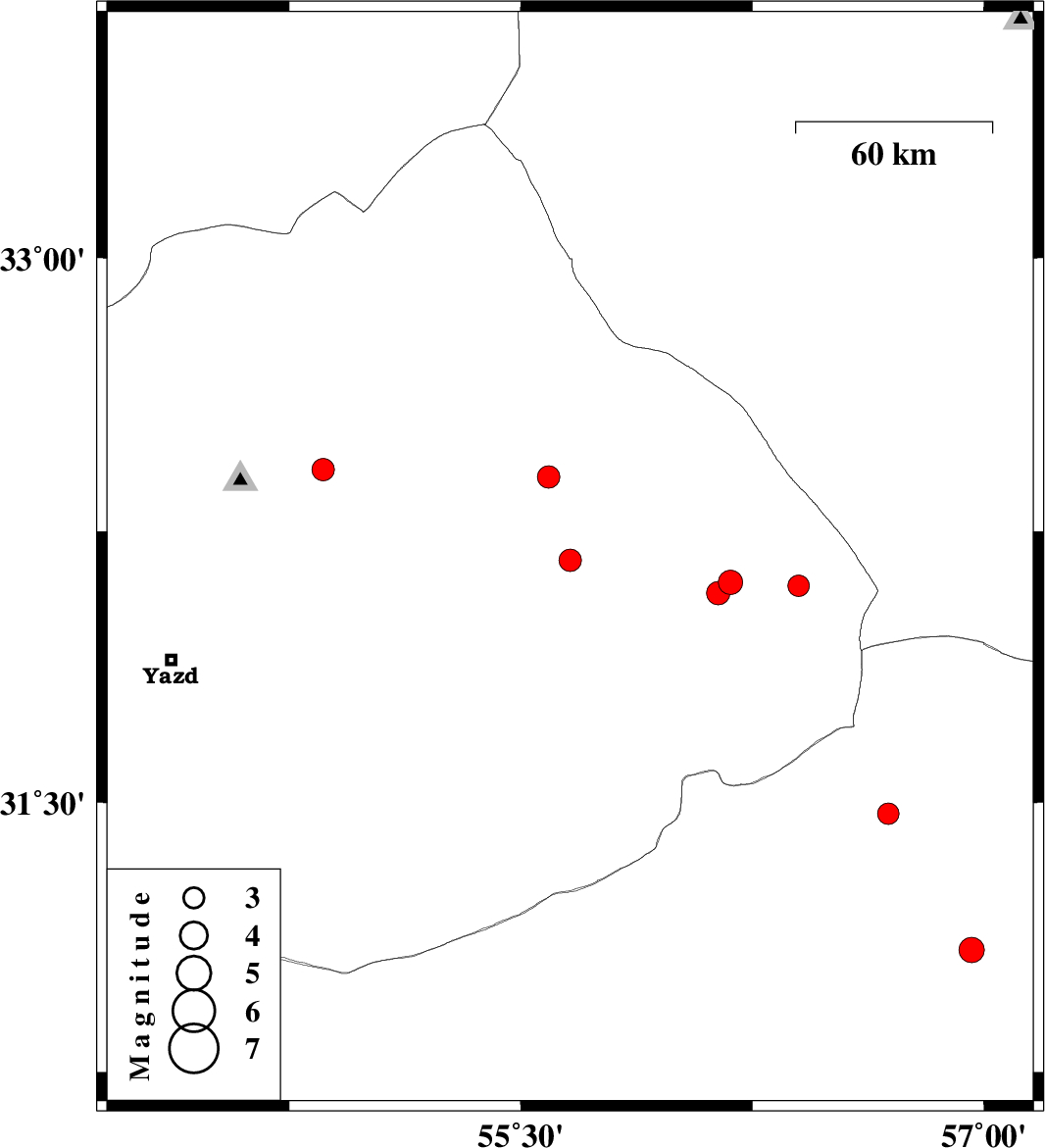 2010/03/04 | 16:21:22.7 | 19:51:22.7 | 32.1 | 56.4 | 14 | ML:3.1 | Yazd Province, 101 km North-West of Ravar | ||