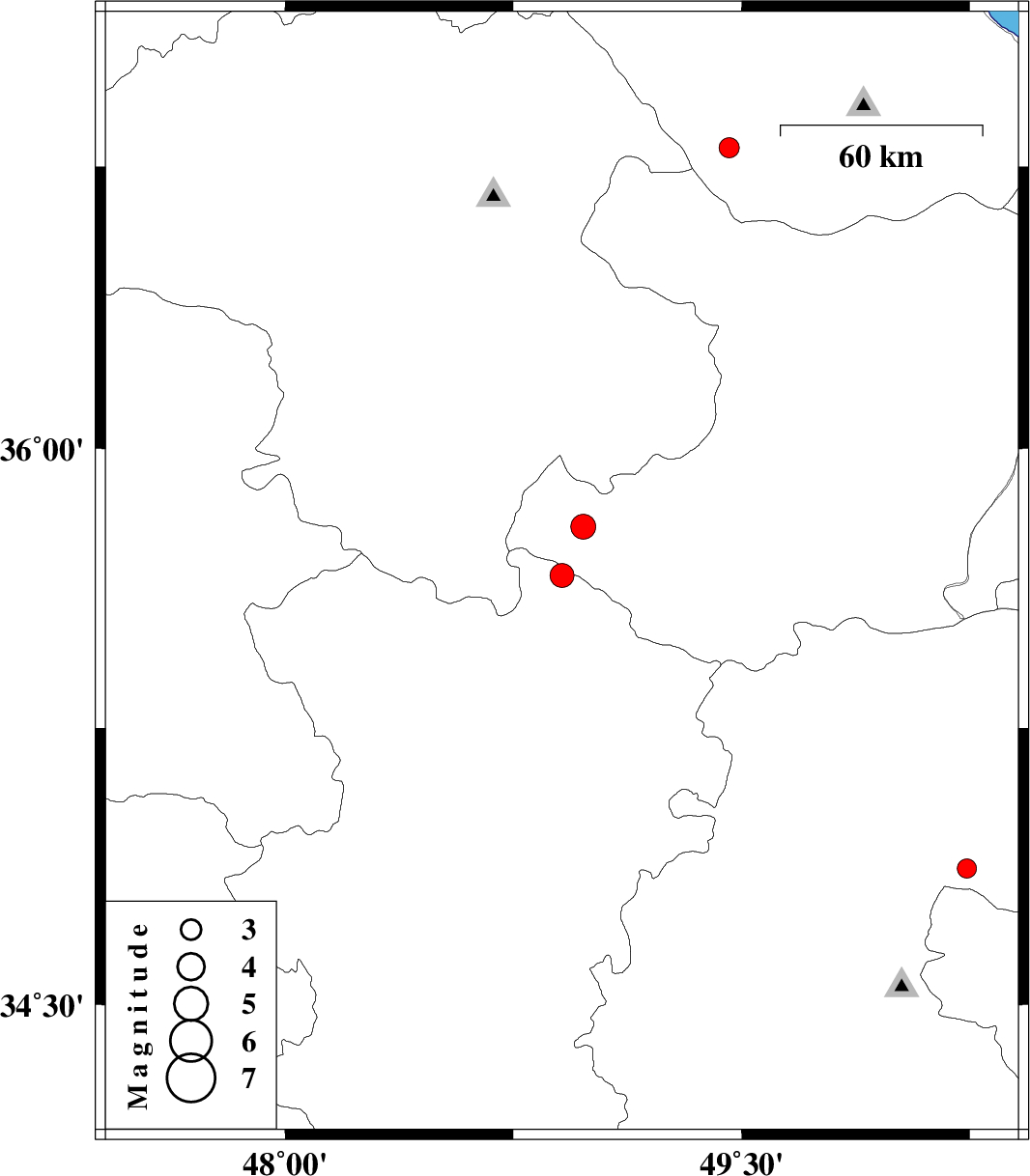 2010/03/04 | 16:38:49.4 | 20:08:49.4 | 35.79 | 48.98 | 33 | ML:3.7 | Ghazvin Province, 46 km North of Razan | ||