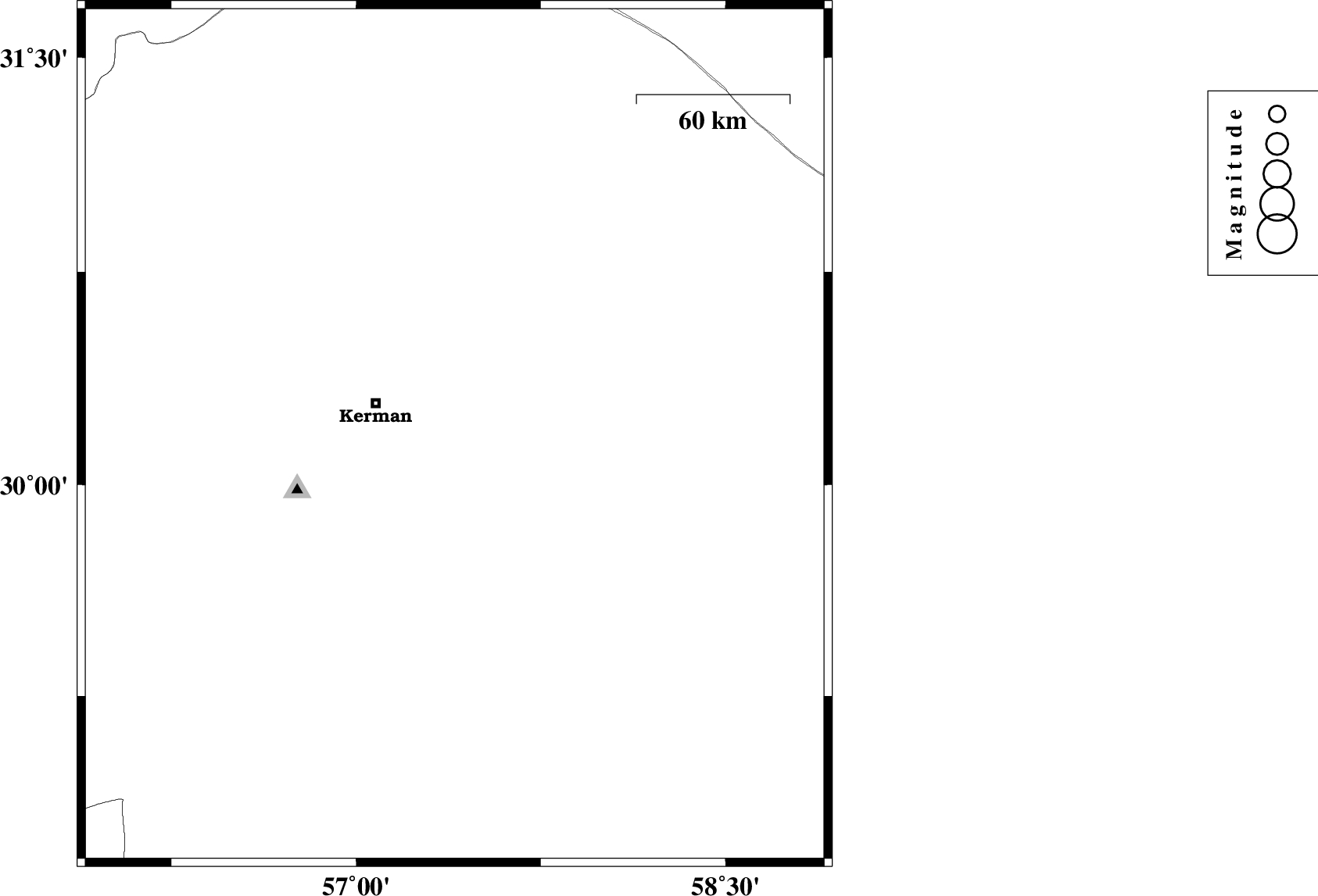 | 2010/03/08 | 16:39:35.2 | 20:09:35.2 | 30.3 | 57.7 | 14 | ML3.8 | Kerman Province, 60 km East of Kerman | ||