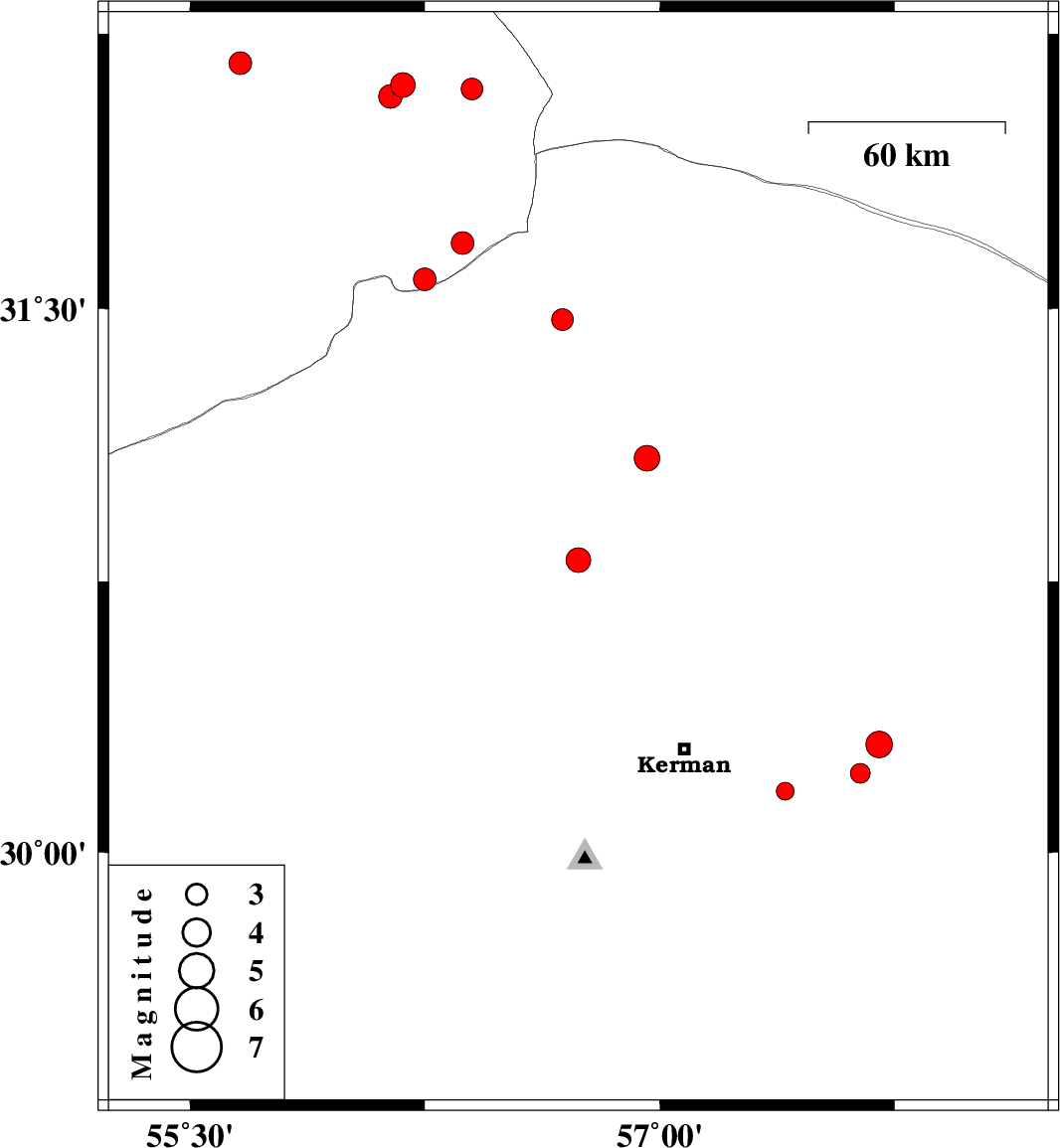 2010/03/08 | 16:39:35.2 | 20:09:35.2 | 30.3 | 57.7 | 14 | ML:3.8 | Kerman Province, 60 km East of Kerman | ||