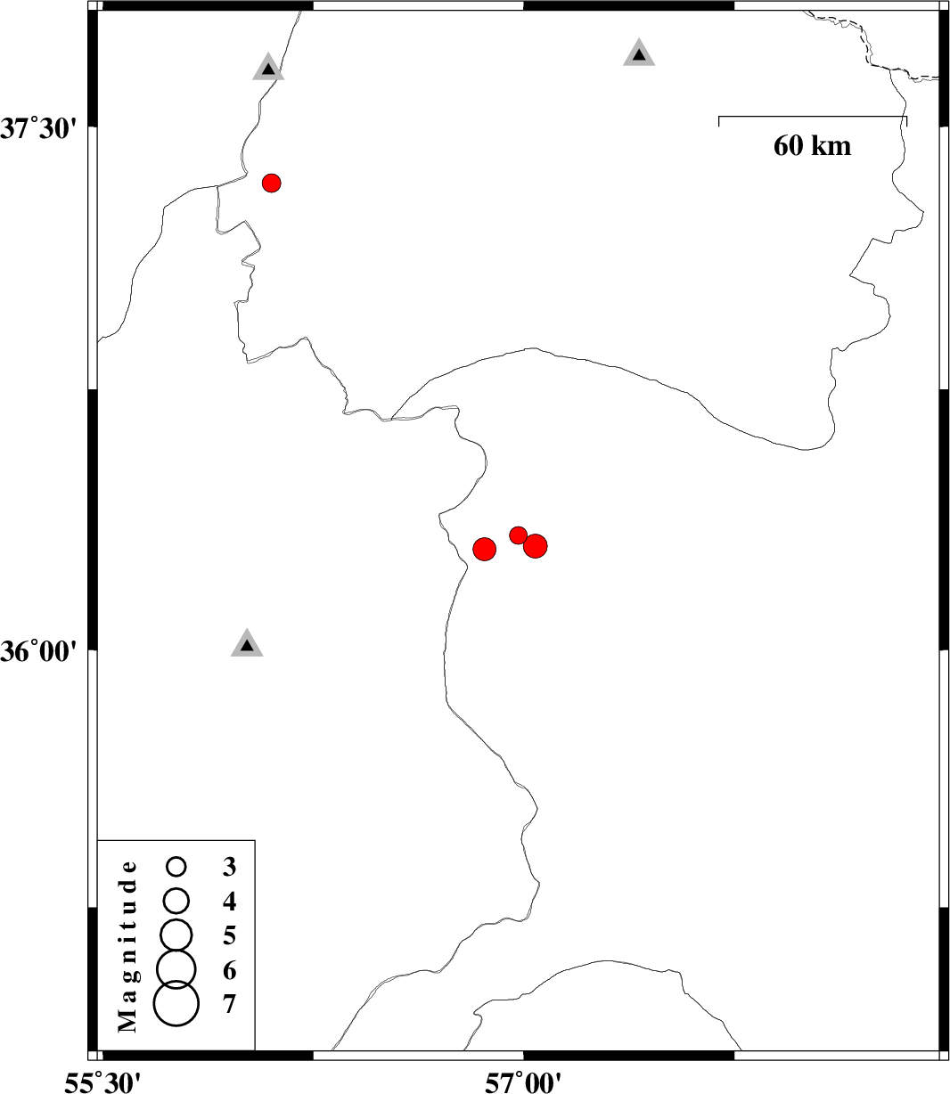2010/03/19 | 15:03:52.2 | 18:33:52.2 | 36.3 | 57.04 | 14 | ML:3.8 | Khorasan(center) Province, 58 km West of Sabzevar |