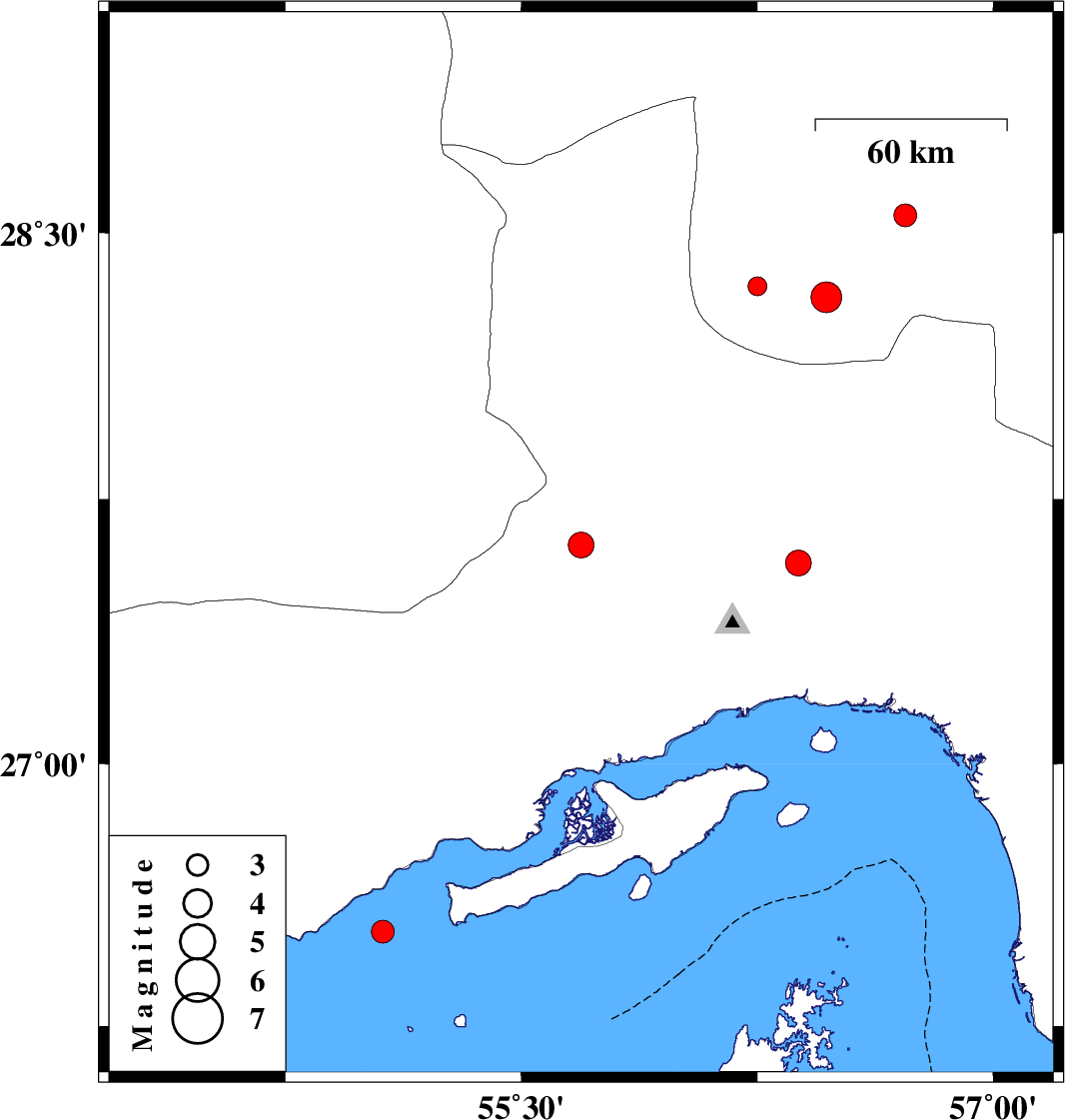 2009/06/19 | 08:16:04.6 | 12:46:04.6 | 27.57 | 56.38 | 14 | ML3.7 | 44 km North of Bandar-e abbas, Hormozgan Province | ||