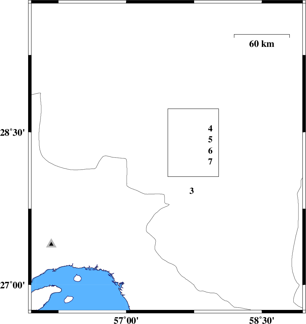 2009/07/05 | 21:51:26.6 | 02:21:26.6 | 28.25 | 57.45 | 14 | ML3.2 | Kerman Province, 41 km North-West of Kahnuj |