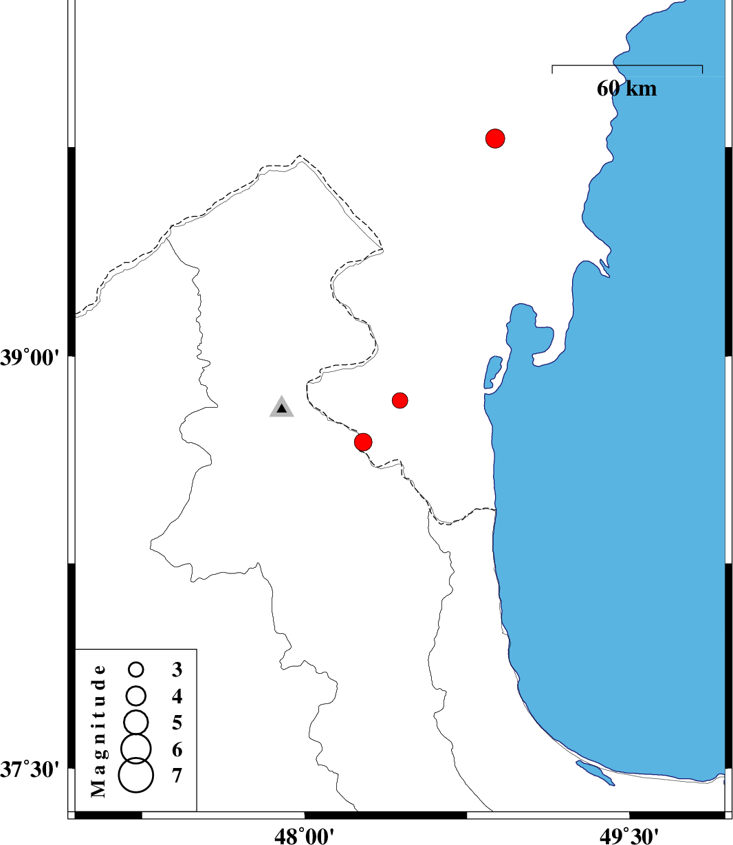 2009/06/16 | 16:21:18.6 | 20:51:18.6 | 38.69 | 48.27 | 15 | ML3.7 | 32 km North-West of Namin, Ardebil Province |
