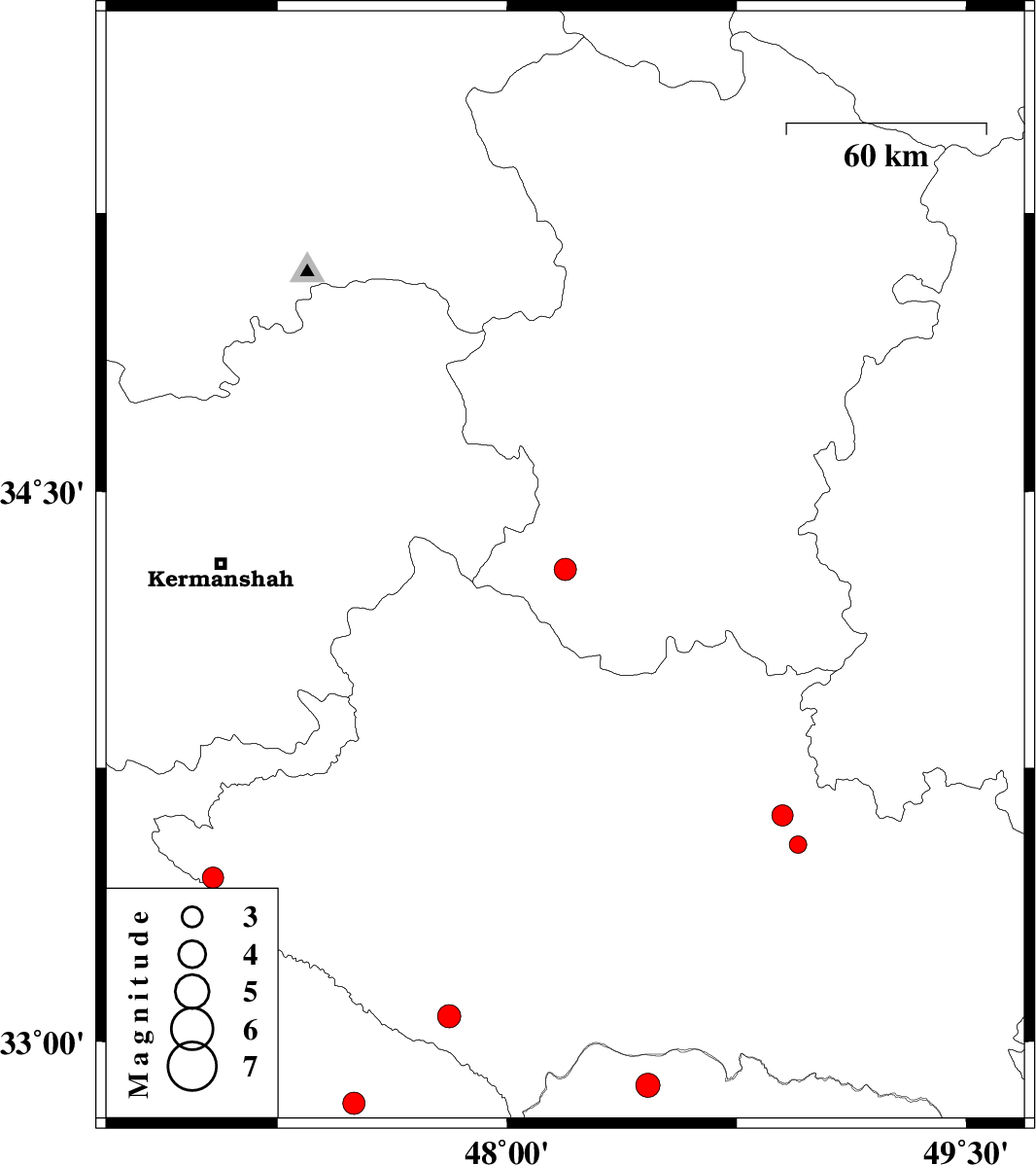 2009/06/24 | 14:39:07.6 | 19:09:07.6 | 33.45 | 47.04 | 14 | ML3.1 | 43 km North-West of Darreh Shahr, Ilam Province | ||