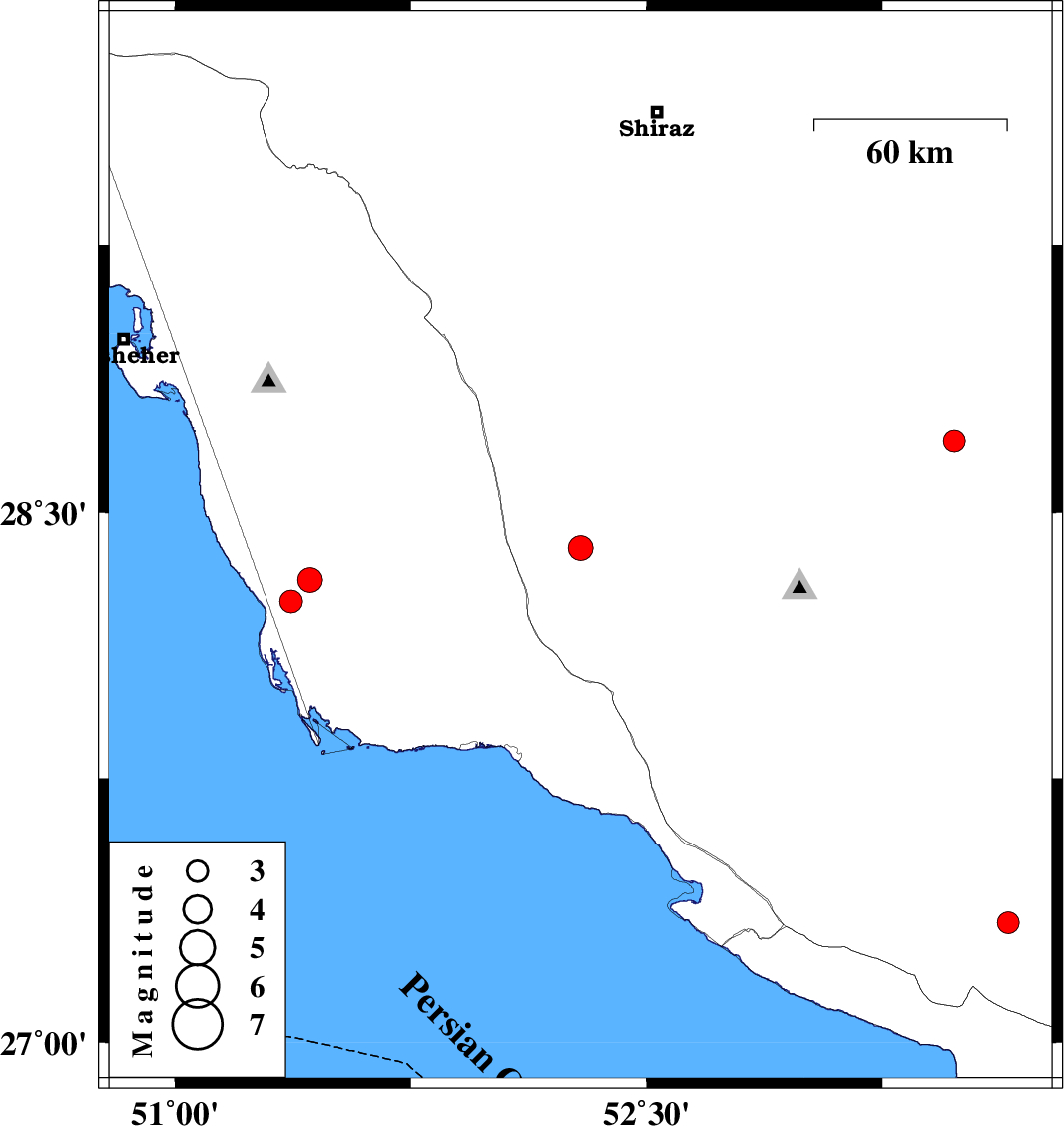 2009/07/04 | 06:02:52.8 | 10:32:52.8 | 28.25 | 51.37 | 43 | ML3.3 | Bushehr Province, 45 km South of Khormog | ||