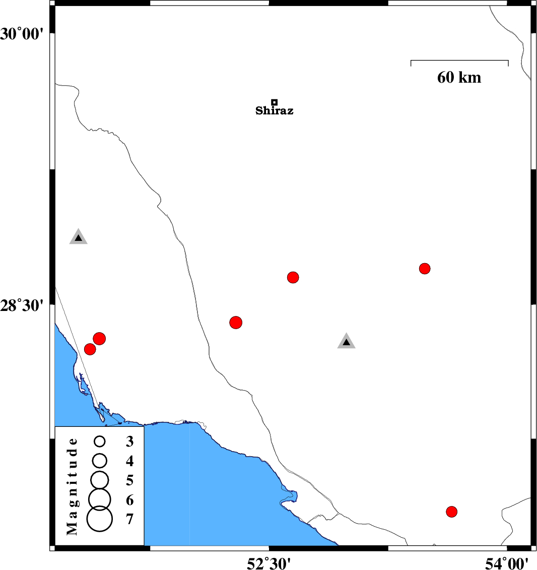 2009/07/12 | 17:38:17.0 | 22:08:17.0 | 28.31 | 51.43 | 44 | ML3.5 | Bushehr Province, 38 km South of Khormog | ||