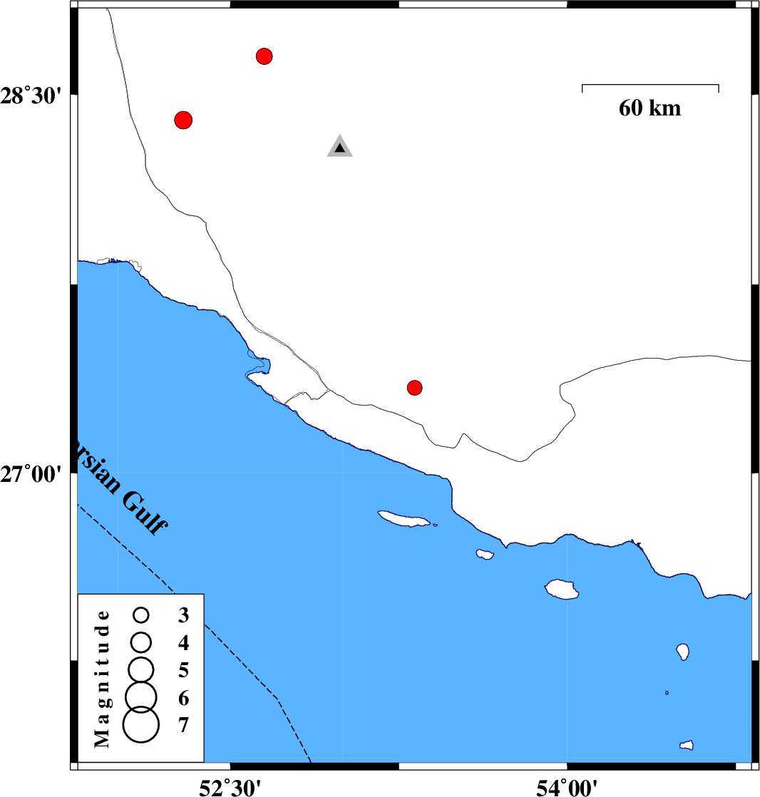 2009/07/21 | 01:49:07.8 | 06:19:07.8 | 27.34 | 53.32 | 37 | ML2.9 | Fars Province, 15 km East of Lamerd | ||