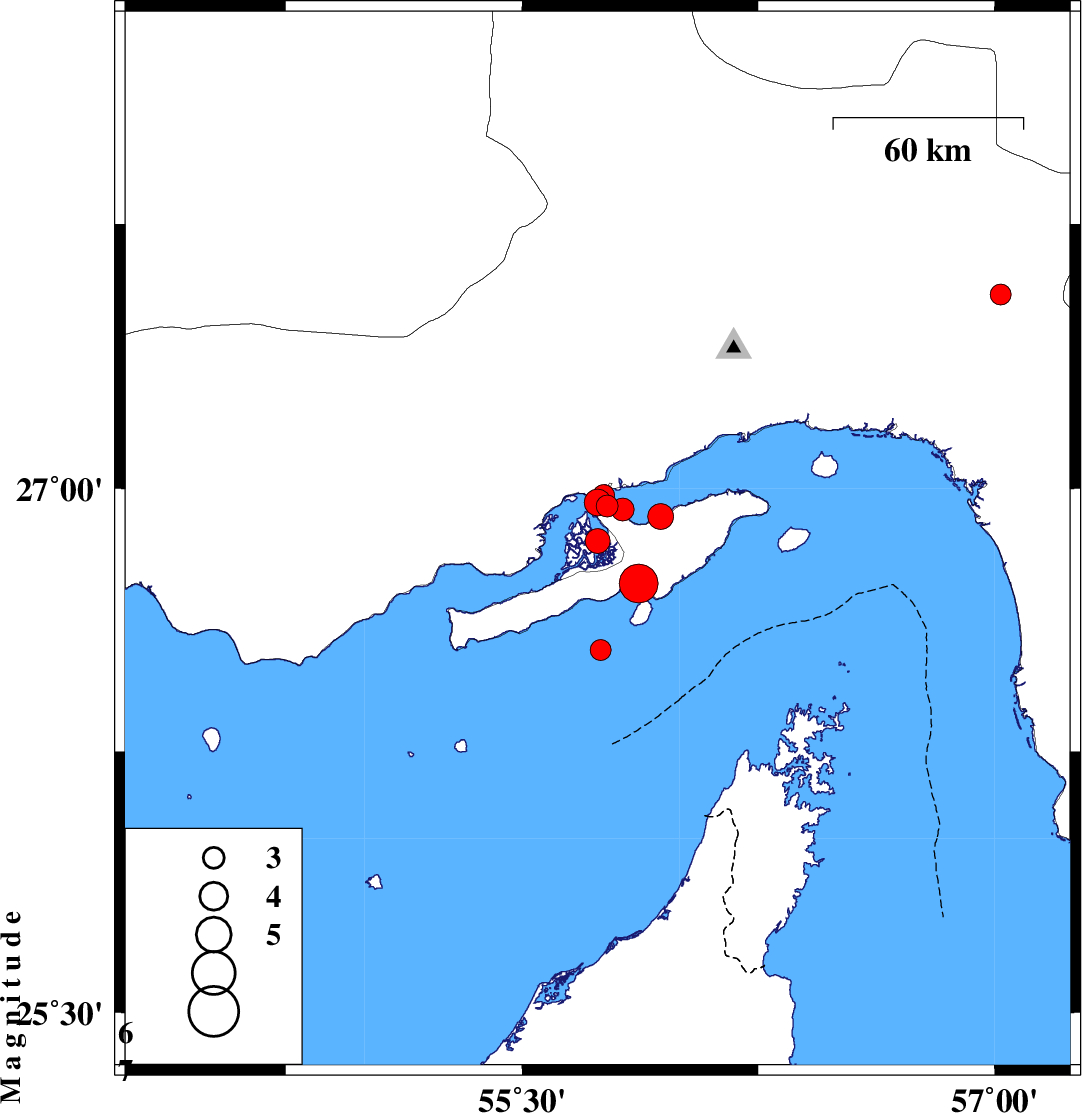 2009/07/22 05:46:57.2 10:16:57.2 26.9855.767 ML3.1 Persian Gulf, 50 km West of Qeshm