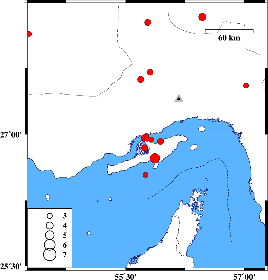 2009/07/22 05:46:57.2 10:16:57.2 26.9855.767 ML3.1 Persian Gulf, 50 km West of Qeshm