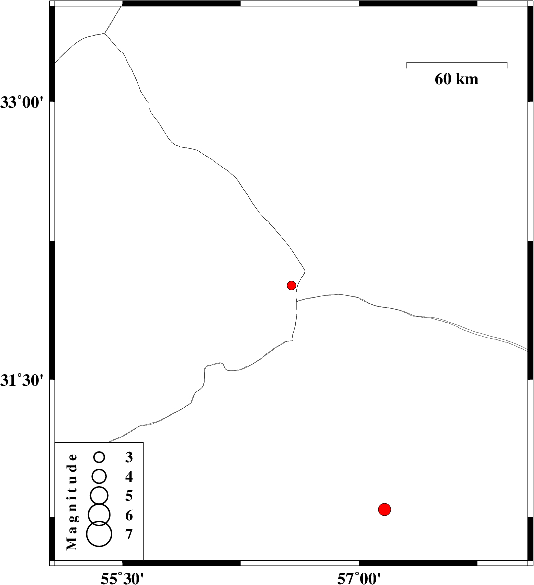 2009/07/18 | 14:24:31.9 | 18:54:31.9 | 30.79 | 57.16 | 15 | ML3.5 | Kerman Province, 56 km North of Kerman |
