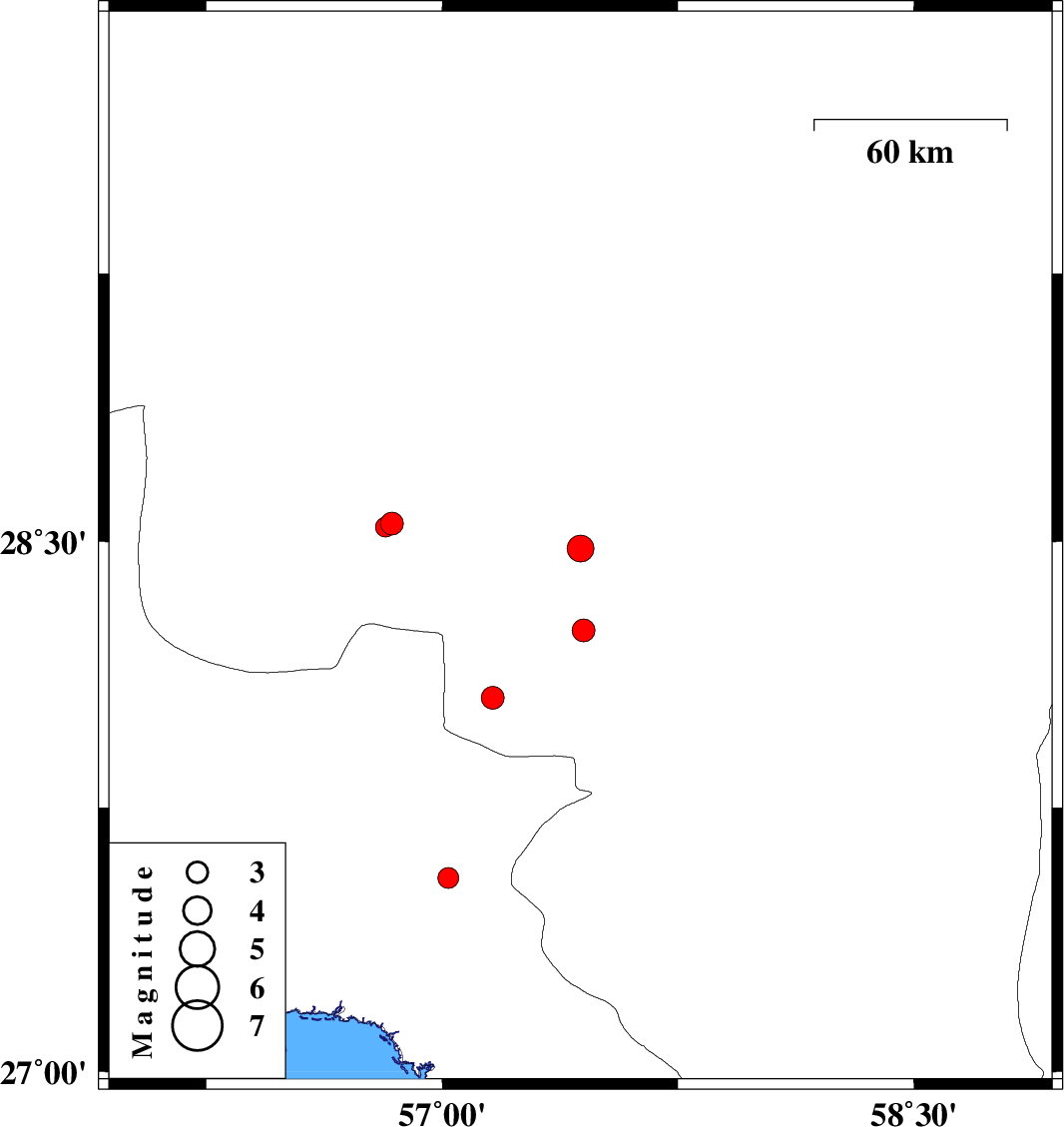 2009/07/05 | 21:51:26.6 | 02:21:26.6 | 28.25 | 57.45 | 14 | ML3.2 | Kerman Province, 41 km North-West of Kahnuj |