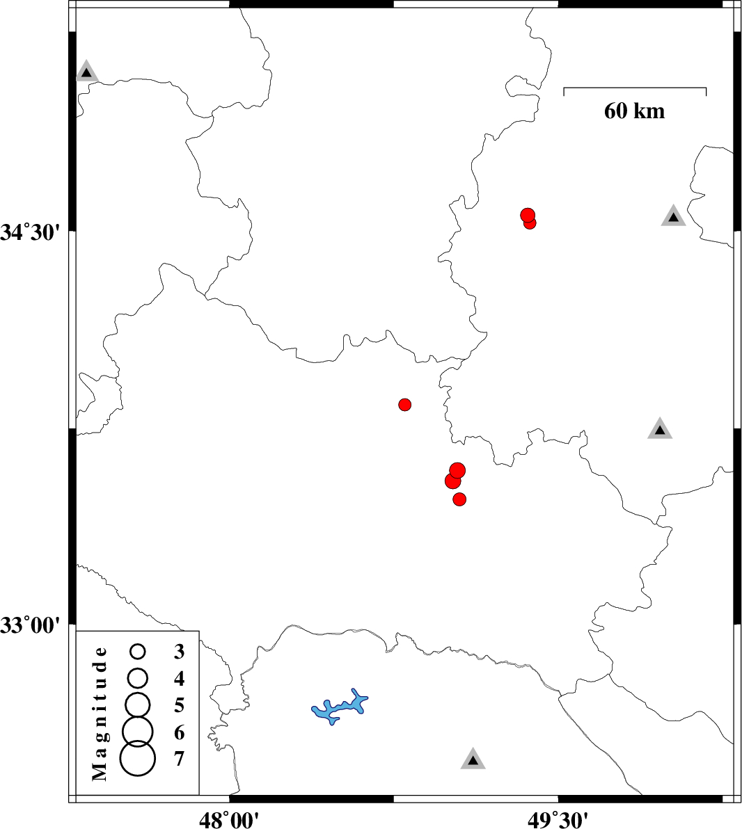 2009/07/25 | 20:37:33.1 | 01:07:33.1 | 33.59 | 49.04 | 15 | ML3.2 | Lorestan Province, 12 km North of Dorud | ||