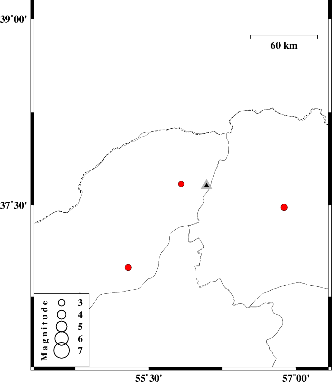 2009/06/30 | 10:09:20.3 | 14:39:20.3 | 37.48 | 56.88 | 28 | ML3.1 | 9 km Ashkhaneh, Khorasan(north) Province | ||