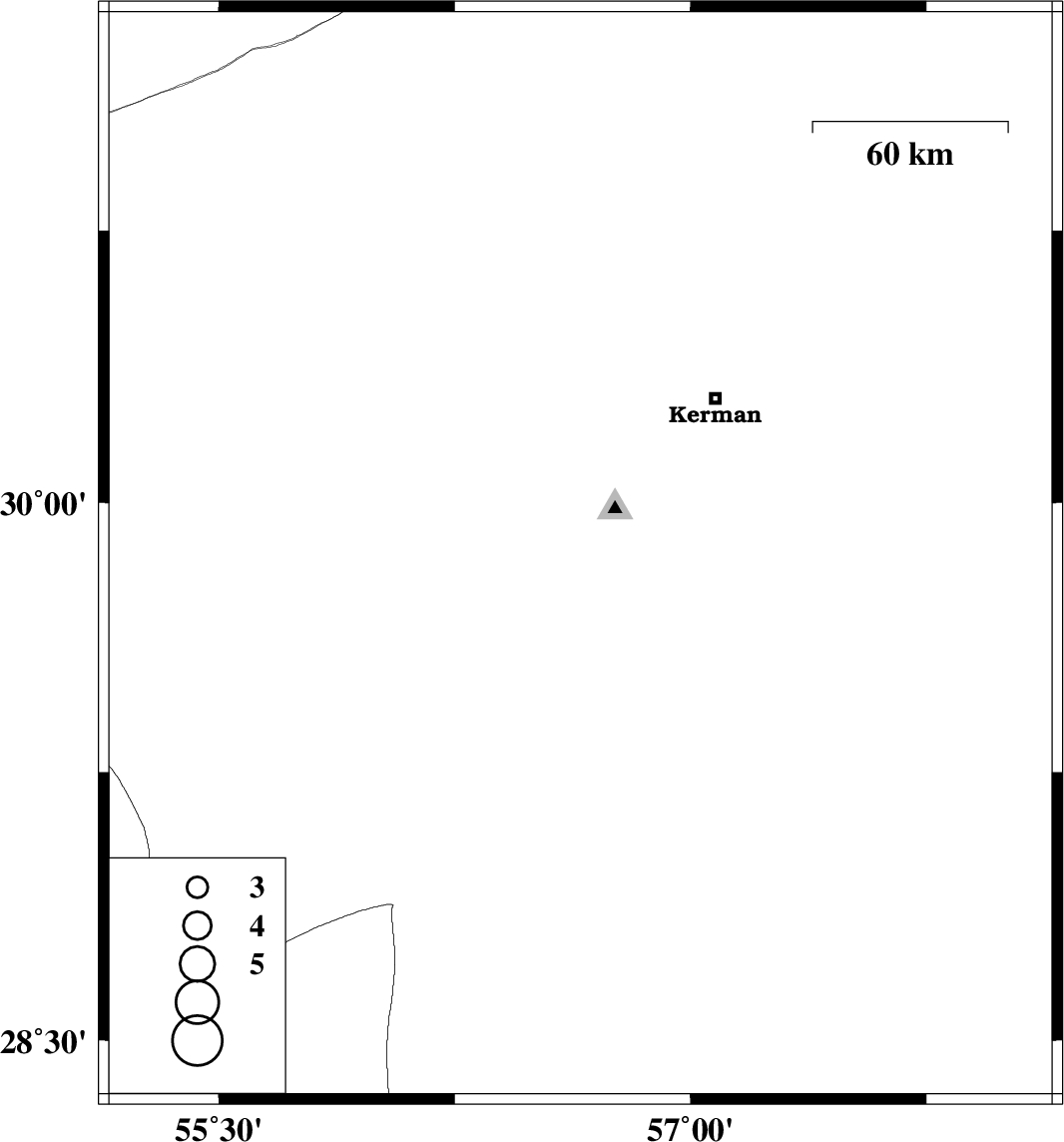 2009/08/06 | 23:39:35.2 | 04:09:35.2 | 29.85 | 56.65 | 6 | ML3.3 | Kerman Province, 11 km Bardsir |