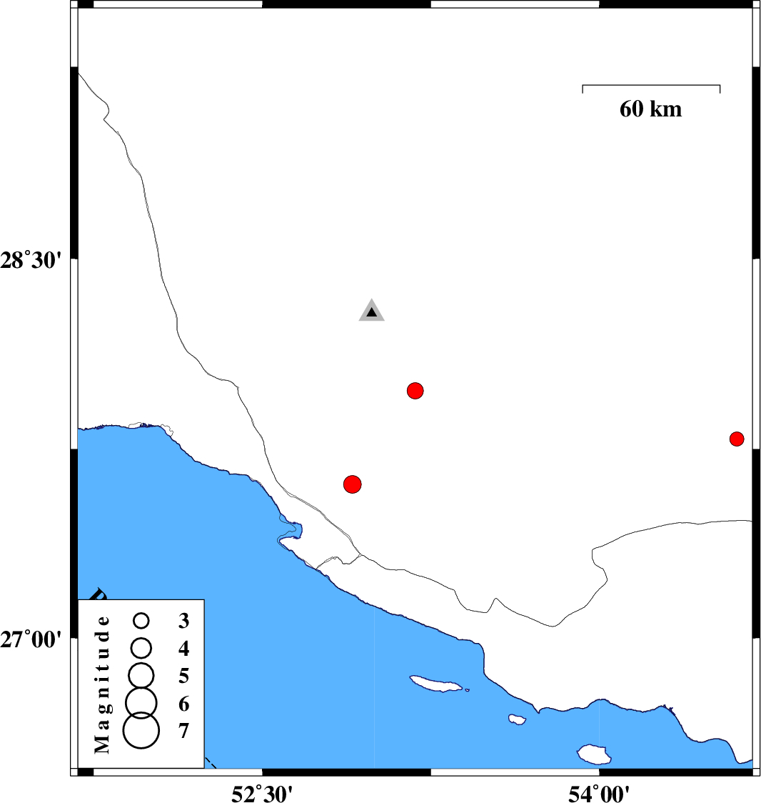2009/08/01 | 09:46:03.9 | 14:16:03.9 | 27.79 | 54.61 | 14 | ML2.8 | Fars Province, 29 km North-East of Lar |