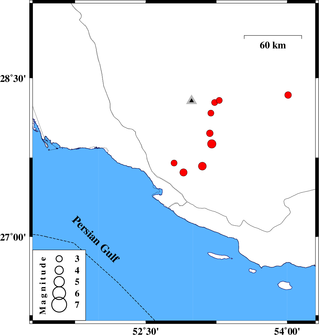2009/08/10 | 11:45:51.9 | 16:15:51.9 | 28.27 | 53.23 | 16 | ML2.9 | Fars Province, 29 km South-East of Qir va Karzin | ||