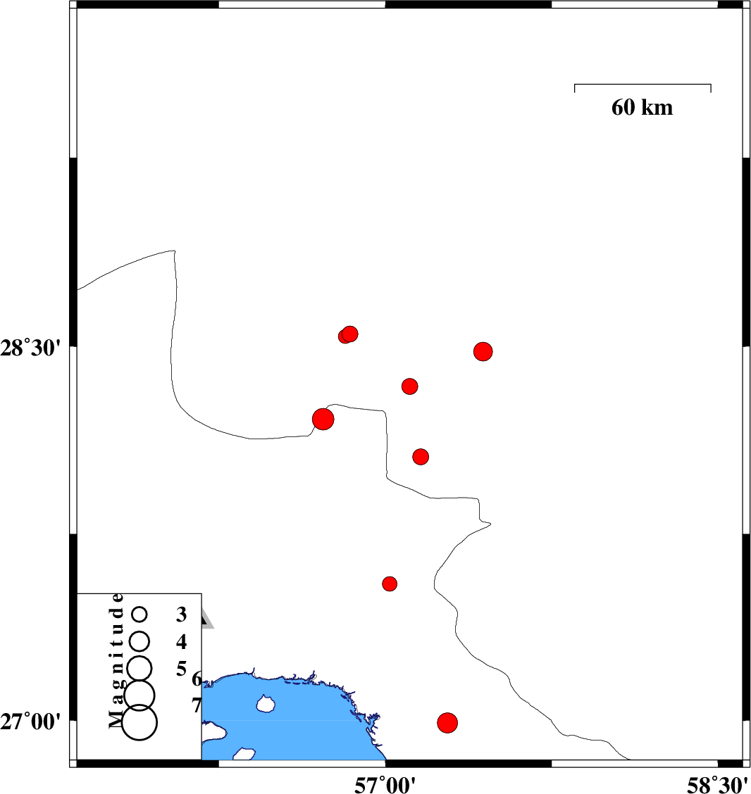2009/08/07 | 18:59:33.9 | 23:29:33.9 | 26.99 | 57.28 | 18 | ML4.1 | Hormozgan Province, 27 km South-East of Minab | ||